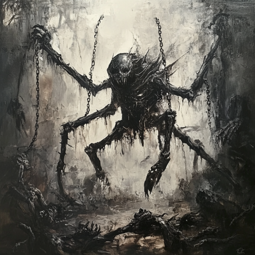 Oil Painted, concept art of a black surreal humanoid insect demon in a battlefield with dead demons around it, chains coming out of his head and ribs, demonic, horror, dark, evil, gothic, misty, occult