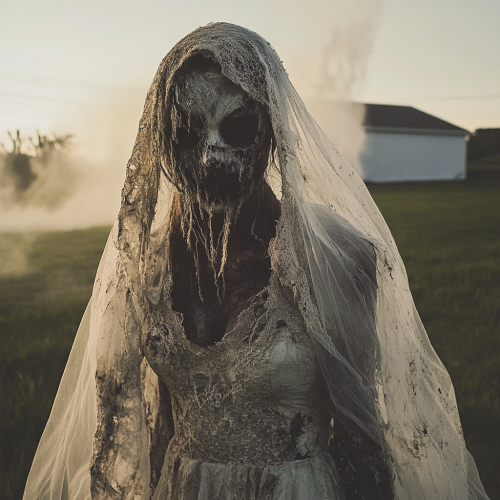 model dressed in a torn and shredded wedding gown, veil over face but through the veil you can see her face looks like a zombie, clothes have dirt and alone all over it, show her in a yard with fog at sunrise, full body scene