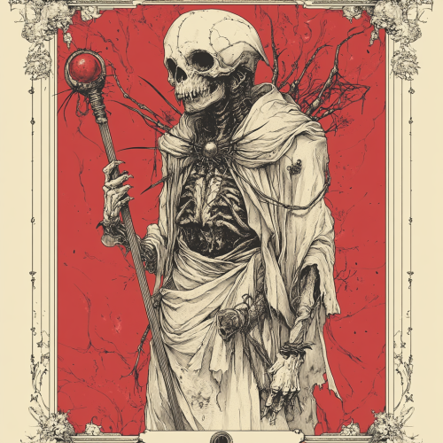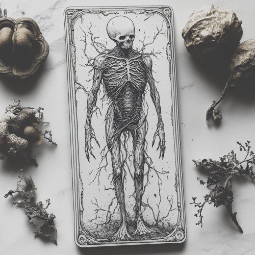 Create me the image of a tarot card in line art, stippling, and hatch work, resembling Renaissance linear. The main character should be a depiction of anxiety only as a creature that looks like static, a monster, skinny and large, long limbs, wild and dangerous --s 750