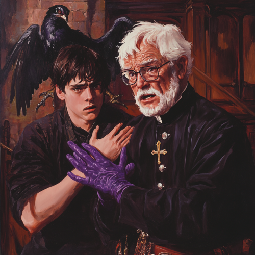angry Colonel Sanders dressed in Catholic priest outfit (black with collar), stands over a handsome young noble being choked by purple ghostly hands, the two are alone, medieval tavern bedroom, --v 6.1