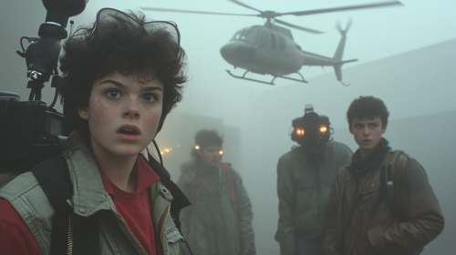 Close up of the faces of a film crew shooting a commercial in 1982 with vintage 35mm move camera & lights, early 1980s, clothing, styles and hair, stand on a foggy loading dock looking confused and looking around in confusion and panic, black helicopters fly overhead, they are surrounded by washing machines which surface out of the ground, fog and grey overcast skies, eerie glowing fog, shallow depth of field, 40mm lens --ar 16:9 --v 6.1 --style raw