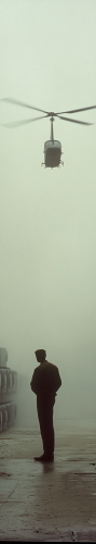 A film crew shooting a commercial in 1982 with vintage 35mm move camera & lights, early 1980s, clothing, styles and hair, stand on a foggy loading dock looking confused and looking around in confusion and panic, black helicopters fly overhead, they are surrounded by washing machines which surface out of the ground, fog and grey overcast skies, eerie glowing fog --ar 16:9 --v 6.1 --style raw