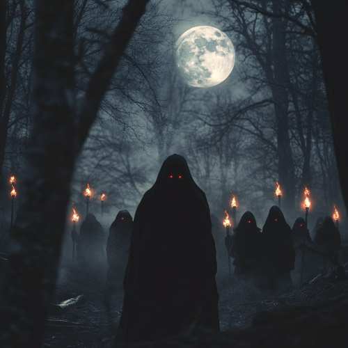 a dark figure blending in with the silhouette of a forest with a full moon in the sky. many othe hooded dark figures with red eyes watching this one dark figure and torches and an evil cult like presence