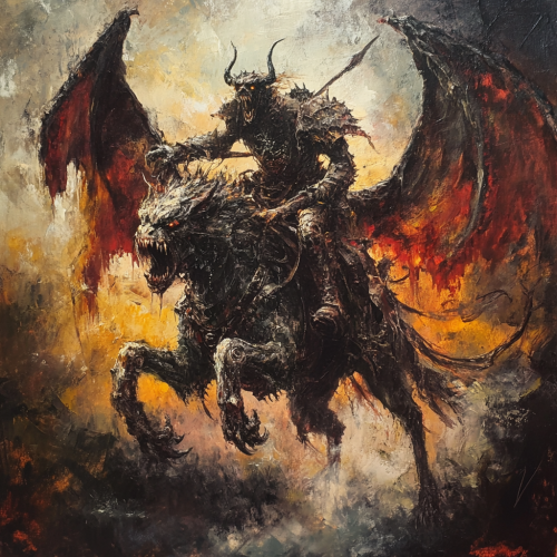 Oil painted surreal demonic monster, riding a demonic monster with wings. He is a monster humanoid creature. fantasy setting, horror, dark, gross, evil, gothic, nightmare, end of the world