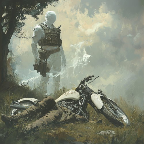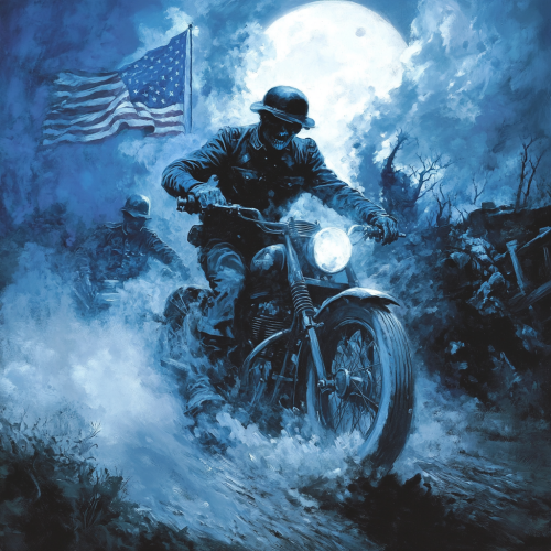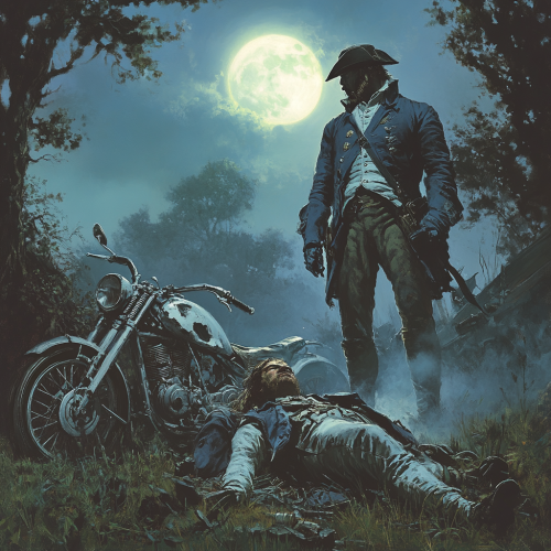 A spectral ghost soldier from the Civil War stands tall and menacing over a fallen American patriot, who looks eerily similar to George Washington. The patriot lies beside a crashed white racing motorcycle, its sleek frame tilted with the back wheel still spinning. Dressed in a blue military coat, white breeches, and a tri-corner hat, the patriot’s face mirrors Washington’s iconic features, with his hat knocked askew and a look of shock and defeat on his face. The ghost soldier, dressed in a tattered Civil War uniform, glows faintly in the moonlight, his hollow eyes fixed on the patriot. His spectral hand rests on the hilt of a translucent saber as mist swirls at his feet. The scene unfolds on a fog-covered, moonlit battlefield strewn with fragments of war--cannons, broken flags, and old trees. The pale glow of the full moon casts long shadows, intensifying the supernatural tension of this haunting encounter.