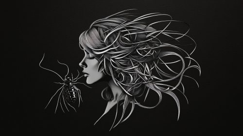 Create a horrifying depiction of a creature that represents severe anxiety. This creature should look almost bug like, termite and leach combined. This creature should be sitting on the back of a man who is depressed with his head down, and this creature is pulling on his hair and bleaching his essence. This should be in the style of line art, and look like a tarot card. --s 750