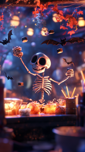 clipart of a cute ghost walking down a spooky gaslit victorian street with cobblestones, there are market stall tables lined up either side outside the buildings with people selling halloween items, cartoon style