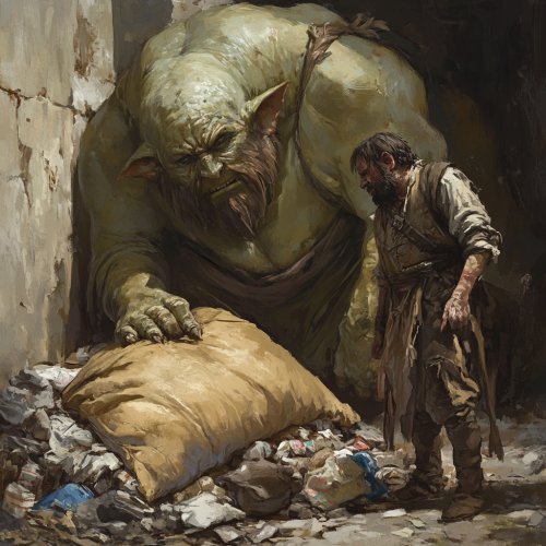 Thief with one arm inside a stained sack besides a massive two-headed giant sleeping on a pile of refuse. One of the giant's heads is awake and peeking surreptitiously at the thief, while the other snores loudly.
