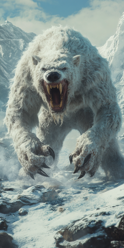 Create an image combining a bat and a polar bear, creating an enormous, scary monster. This monster has sharp , giant teeth. And it is standing on an icy surface with icy mountains. It is Ultra Hd --ar 1:2 --style raw --stylize 200 --v 6.1