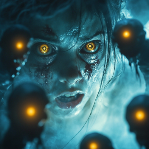negative space background, steampunk horror, close up of screaming possessed girl, blueish rotting skin, sunken eye sockets, yellow eyes, many evil demons standing behind her surreal --style raw --v 6.1 --s 250