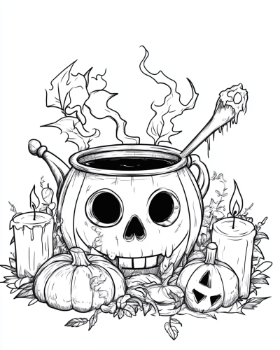 a dark fall halloween night with the silouhette of a forest in the background under a full moon. candles and leaves everywhere among the many yellow, orange, and red leaves scattered everywhere and on the trees as well as lit, evil looking jack o lanterns