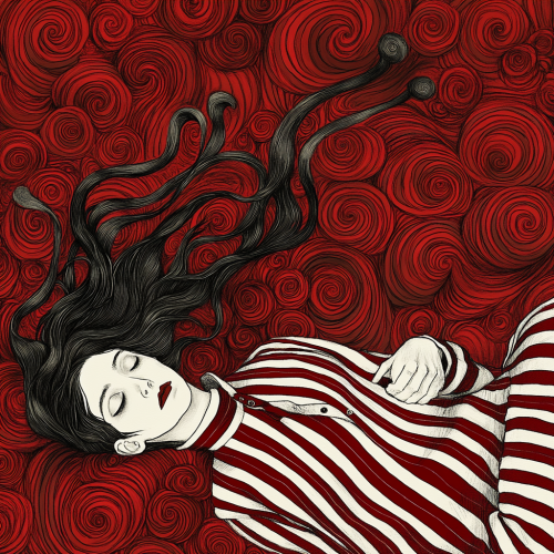 Create an illustration inspired by Edward Gorey, featuring two characters in close, intimate proximity. One figure is dressed in a black, sleek garment with subtle, mechanical elements, while the other is adorned in flowing white lace, evoking an ethereal and surreal aesthetic. Use meticulous cross-hatching to convey shadows and textures, emphasizing both the intricate fabric details and the smooth surfaces of their faces. Their expressions should be blank and emotionless, adding a sense of mystery and detachment. Place them against a minimalist background, allowing symbolic elements--such as abstract patterns or faint, floating objects--to subtly hint at deeper meaning. Balance elegance with eeriness, capturing Gorey’s distinct sense of quiet tension and narrative ambiguity.