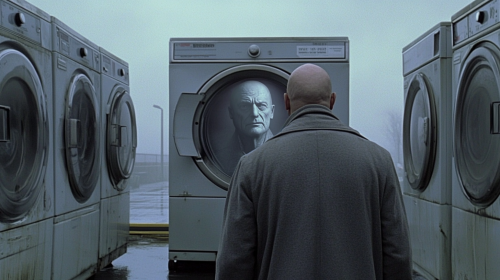 Close up Rear angle of the back of a bald Telly Savalas wearing a grey longcoat on a loading dock surrounded by washing machines walking towards a huge gigantic massive front loading washing machine with the image of a gaunt looking ghostly man's face inside the washing machine, speaking to him an eerie fog and glow from inside the washing machine , fog and grey overcast skies, --ar 16:9 --v 6.1 --style raw
