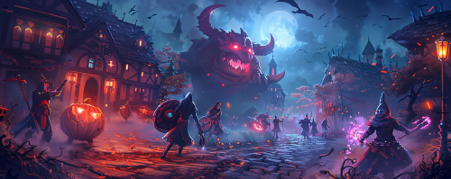 a fantasy style image of warriors dressed in halloween costumes, they weild swords and shields and staffs that glow colors, they are on a path made of square stone at nighttime as they creep from house to house trick or treating, there is a scary big demon monster in the background that is red in color and has red glowing eyes, the warriors do not notice this demon yet, the setting is at night with torch light glow and stars are bright, the square stone path is very visible, medieval town and houses --v 6.0 --ar 5:2