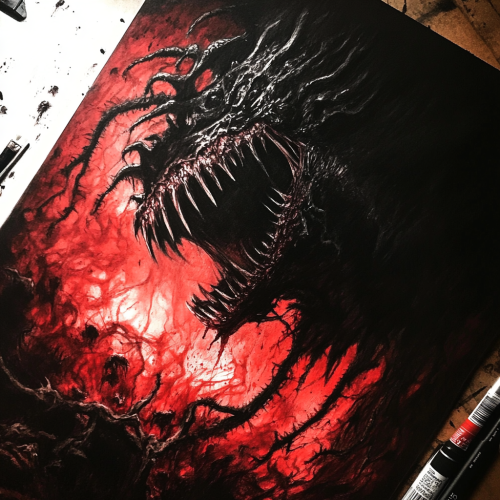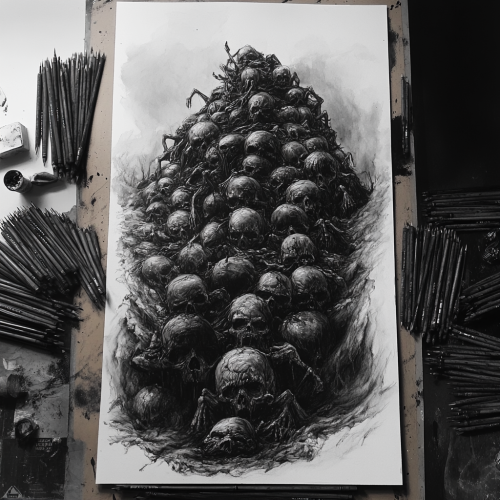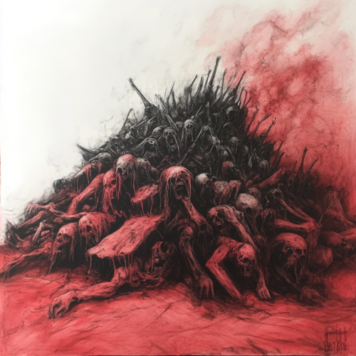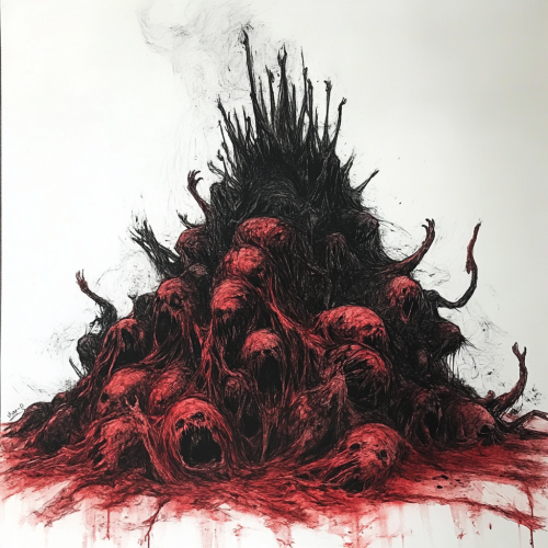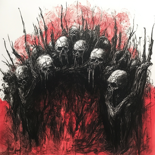 Detailed drawing with red & black Charcoal of a meat pile made of 100000 crawling people, horror, war, Skyrim, demonic, apocalyptic, decay, agony torment, Clive Barker hellraiser style
