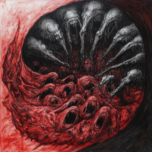Red and black Charcoal drawing of a endless crawling meat pile made of people screaming, horror, war, Skyrim, demonic, apocalyptic, decay, agony torment, Clive Barker hellraiser style