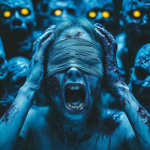 dark blue background, close up of screaming woman blindfolded, behind her zombies blueish rotting skin yellow eyes about to attack surreal --style raw --v 6.1 --s 250
