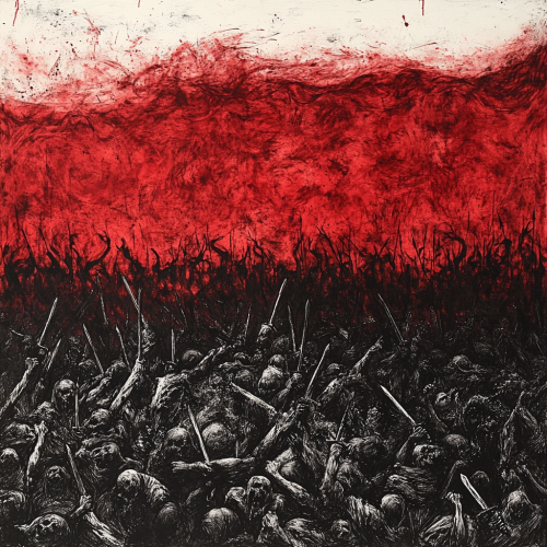Clive Barker hellraiser style of a Neverending meat sea made of millions of drowning people screaming & reaching out in hoards with swords floating in the sea as the people grab each other, horror, war, Skyrim, decay, agony torment, Red and black Charcoal