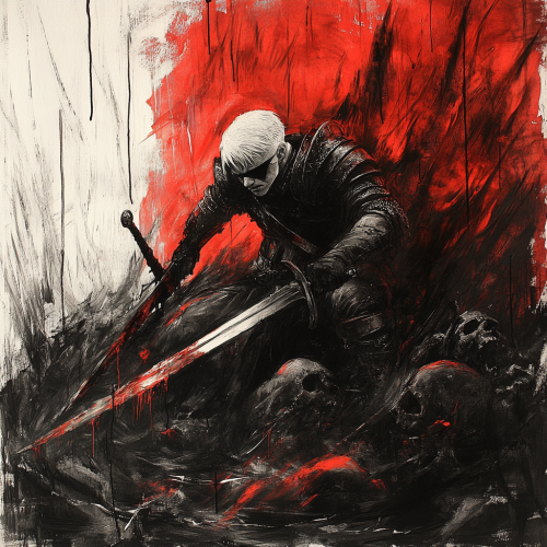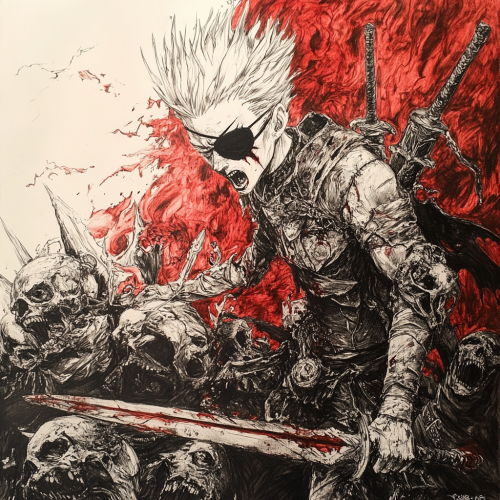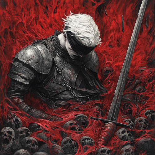 Clive Barker hellraiser style of a young Griffith Targaryen albino knight with eyepatch drowning in a sea of tormented souls with swords, horror, war, Skyrim, decay, agony torment, Red and black Charcoal, screaming