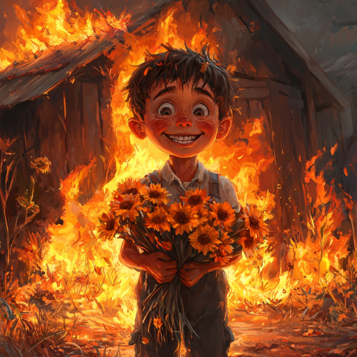 a boy standing holding a bunch of flowers that have half burned away. he is grinning, overdrawn smile. there is a shed on fire behind him --s 250 --q 2