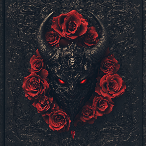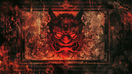 A currency note with a devilish face in the center, bold and fierce expression, surreal and abstract design, blending currency elements with mystic symbols, red and black hues with hints of gold, backlighting for an ethereal glow, high contrast shadows --ar 16:9 --v 6.0