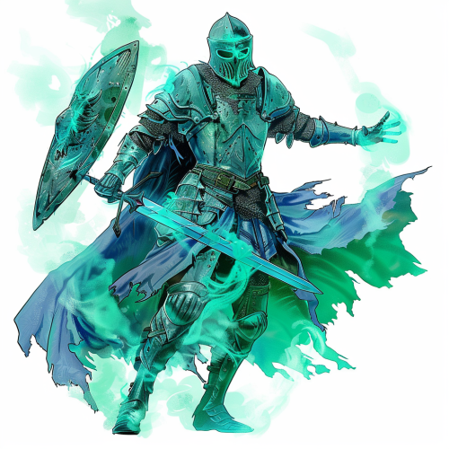 green-blue undead ghostly knight in armor In the style of pathfinder wrath of the righteous and pathfinder kingmaker style of James Ryman Drawn D&D art --v 6.0 --s 50