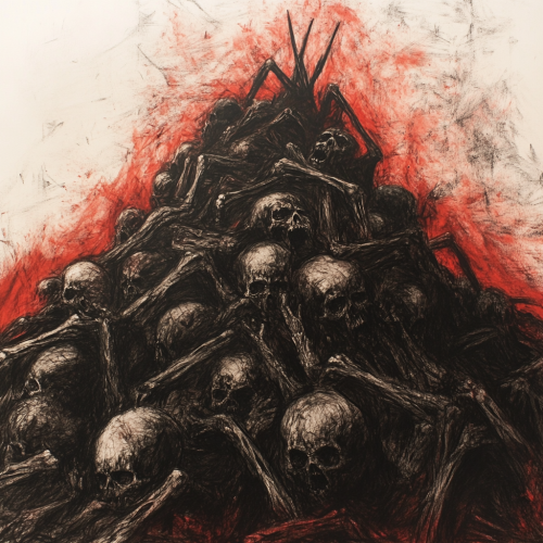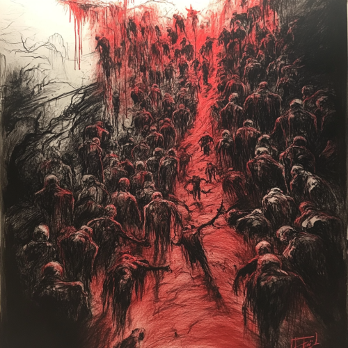 Detailed drawing with red & black Charcoal of a pile made of 100000 crawling people, horror, war, Skyrim, demonic, apocalyptic, decay, agony torment, Clive Barker hellraiser style