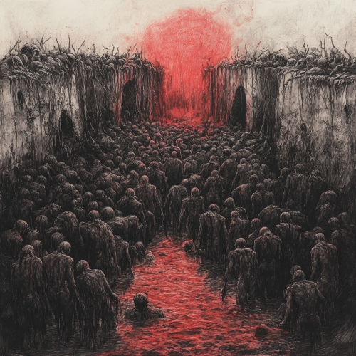 Clive Barker hellraiser style Red and black Charcoal drawing of a endless meat sea made of millions of drowning people screaming in hoards with swords, horror, war, Skyrim, decay, agony torment, zombies floating