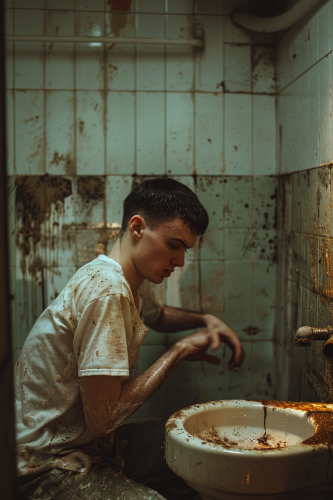 close up of boy's face going mad watching a washing machine spinning, the washing magine can be seen in full and it's trembling like crazy, the kid's eyes are all looking in weird directions --ar 16:9