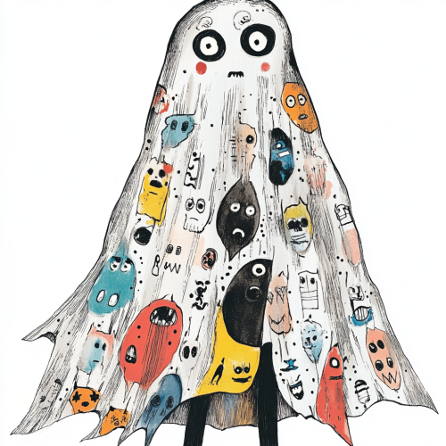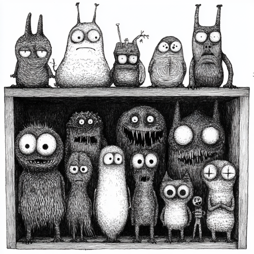 Illustrate a character inspired by Edward Gorey's unique style, blending whimsical surrealism with a touch of eerie charm. The character should be wrapped in an oversized, patterned garment decorated with playful, monster-like faces and bright geometric shapes. Use meticulous cross-hatching to create depth and texture in the garment, capturing the intricate details of each design element while adding a shadowed, Gorey-like atmosphere. Keep the character’s expression subdued and neutral, with minimal emotion, while their hair and accessories add a pop of surreal color. The background should remain minimalistic, enhancing a sense of isolation, with any added symbols (like abstract shapes or mysterious eyes) contributing to an unsettling yet playful vibe.