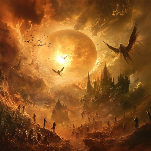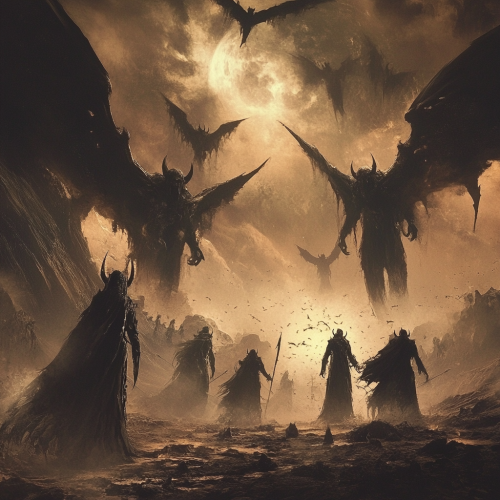 a group of demons and evil wicked vampires ruling the planet of earth after an apocalypitc war agasint humanity and good. escape vessels of the angels are seen in the sky leaving earth behind.