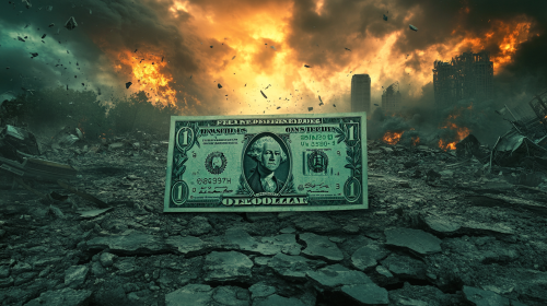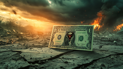 A full view of a dollar bill with a devil's head in the center of the bill, laying on cracked, desolate ground, surrounded by rubble and ruins, dark stormy skies with fiery clouds in the background, debris floating in the air, intense contrast between green dollar and dark surroundings, apocalyptic lighting --ar 16:9