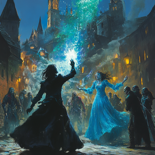 a sorcerer dressed in black is getting banished by the magic cast by a mage in a bright blue dress. There are a couple of confused zombies in the background. Night time, but the sun is about to rise.