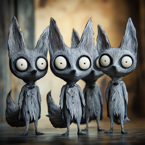 Illustrate a group of small, fox-like figurines with exaggerated, almost puppet-like expressions and a slightly eerie charm, inspired by Edward Gorey's style. Use intricate cross-hatching and fine linework to add texture to their fur and costumes, creating depth and shadow. Each figure should have simple yet distinctive details, such as large, round eyes and pointed ears, capturing a whimsical yet unsettling vibe. The background should be minimalistic, using soft shadows to emphasize their isolation and positioning on a reflective surface. Subtle, symbolic motifs, like faint swirling patterns or ghostly silhouettes, should be incorporated to enhance the mysterious atmosphere.