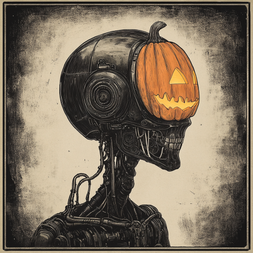 Illustrate a haunting figure holding a glowing jack-o'-lantern, dressed in a dark, Gothic-inspired outfit with intricate details, and wearing a wide-brimmed hat adorned with twisted branches. Use Edward Gorey's signature cross-hatching technique to create rich shadows and detailed textures, especially on the clothing and pumpkin, enhancing the eerie atmosphere. Design the character with a solemn, almost emotionless expression, with hollow, glowing eyes that convey a quiet menace. Keep the background minimal, using a subtle, misty darkness to focus attention on the figure and the glowing pumpkin. Add symbolic elements, such as faint skeletal or ghostly shapes, to evoke a mysterious and unsettling narrative.