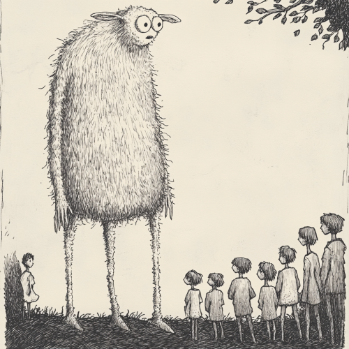 Illustrate a surreal, otherworldly scene in Edward Gorey’s style, featuring a tall, woolly creature resembling a sheep with elongated, puppet-like limbs standing among a crowd of children and adults. The creature's design should be simple yet unsettling, with minimal facial features and a detached expression. Use meticulous cross-hatching to create shadows and texture, especially on its woolly body and thin legs, giving it an eerie depth. Depict the children with simple, exaggerated silhouettes, staring at the creature with curiosity or slight unease. Keep the background sparse, focusing on symbolic elements such as scattered leaves or shadows that hint at the creature’s mysterious origin, while using negative space to enhance the surreal atmosphere.