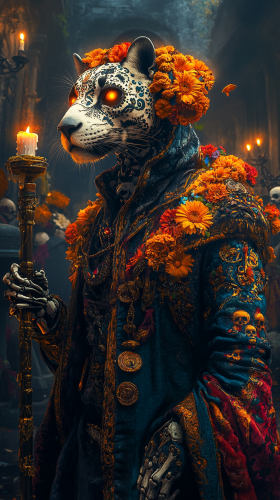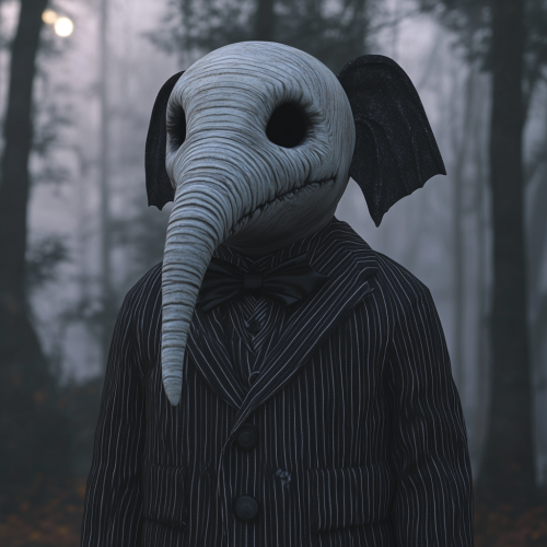 A large, realistic elephant standing upright, wearing a meticulously detailed Jack Skellington costume from The Nightmare Before Christmas. The elephant is dressed in a black pinstripe suit with a bat-shaped bow tie, evoking Jack Skellington’s signature style. The background is a spooky, misty forest at dusk with faint moonlight filtering through the trees. The elephant has a friendly yet eerie expression, matching the Halloween theme. Highly detailed textures on both the costume and the elephant's skin, capturing the surreal yet realistic effect. 4k resolution