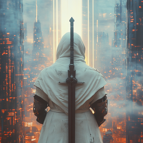 a beautiful figure in a white hood. With a sword of god. Overlooking a futuristic religious city. Cosmic horror. Futurism. Ultra realistic. Space futurism. Ω. Crucifix’s.