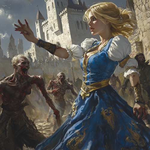 A young female mage dressed in a bright blue dress with a white top with gold trims. She is casting a spell to banish a confused zombie while another zombie is looking confused. Grey weather but daylight, White castle in the background under attack by more zombies.