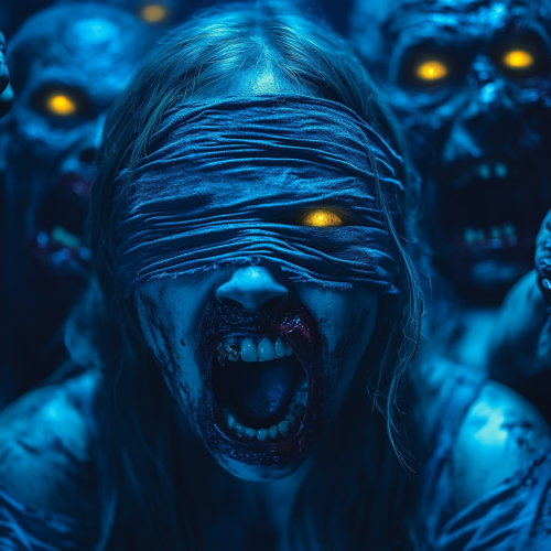 dark blue background, close up of woman blindfolded, behind her zombies blueish rotting skin yellow eyes about to attack her surreal --style raw --v 6.1 --s 250