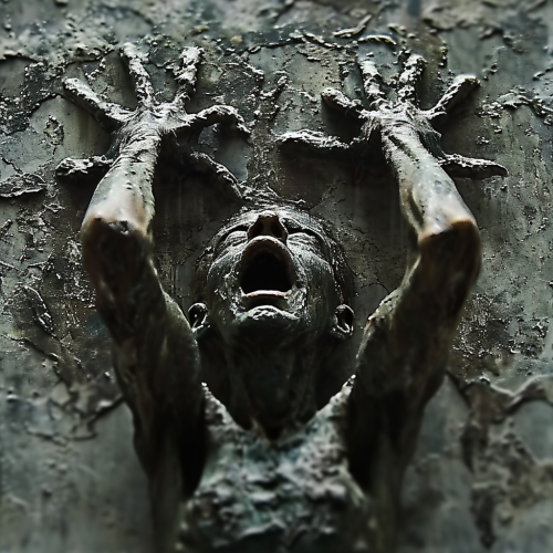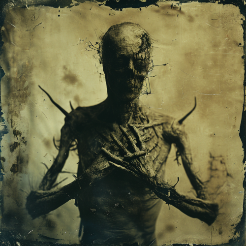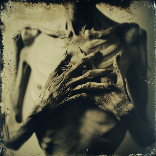 emaciated torso with both hands holding long nails, grimy, horror, blurry and out of focus, peeling film emulsion and scratches --style raw --v 6.0