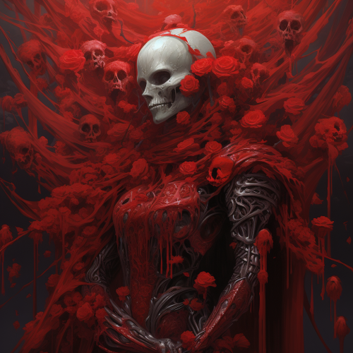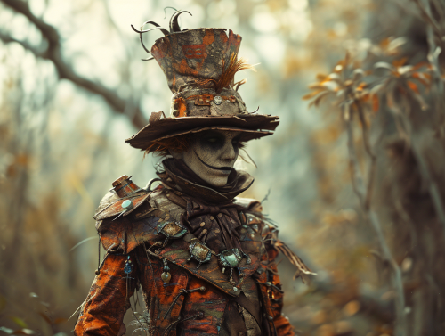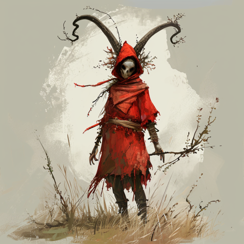 character design of creepy female scarecrow, painted red, with straight antelope horns --v 6.0