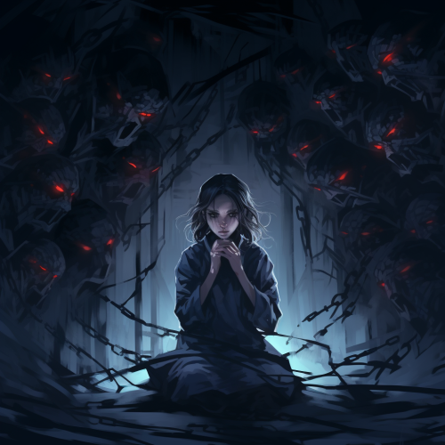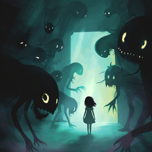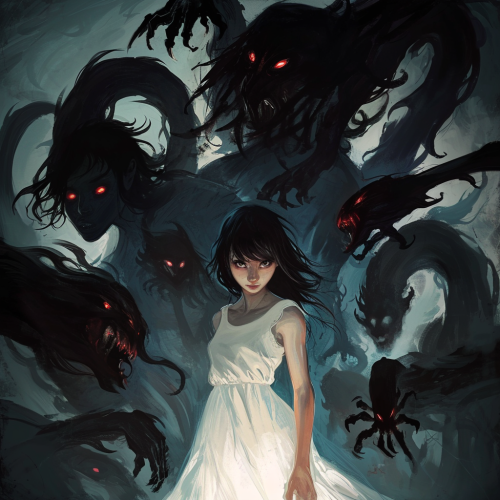 a scared girl is sorounded by shadow monsters born from her subconscious. --v 6.0 --s 50 --style raw