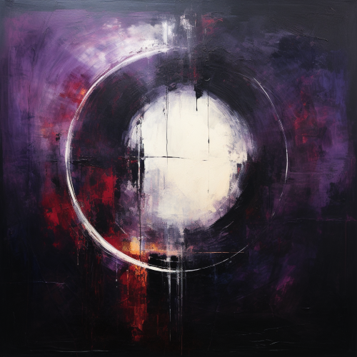 abstract painting with purplr circle in the middle, outside of circle stands for a dark and evil side, inside of the circle stands for a calm and good side