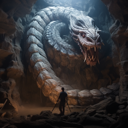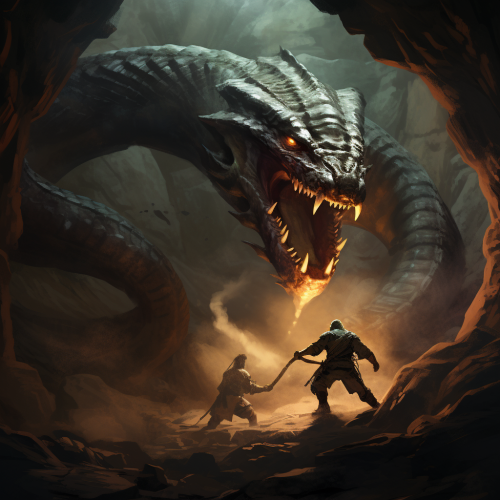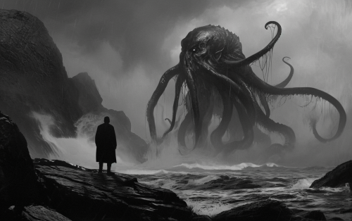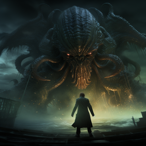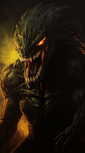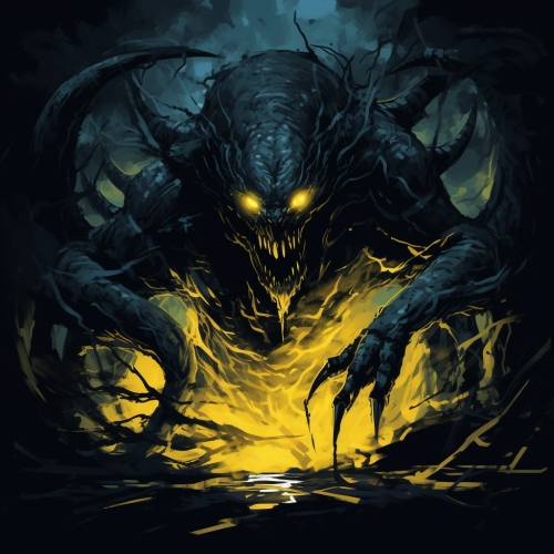 comic style serpentine eldritch monster slithering from the darkness with bright yellow eyes and razor sharp teeth. Dark eldritch themes, Lovecraftian themes