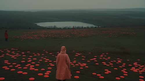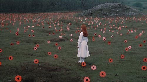 dvd screengrab of a battlefield with white circles where people had died, siren, directed by nobuhiko obayashi, style of alejando jodorowski, uncanny valley, hausu 1977, suspiria 1977, thalassophobia. --v 5.0 --ar 16:9