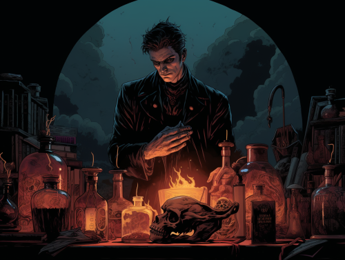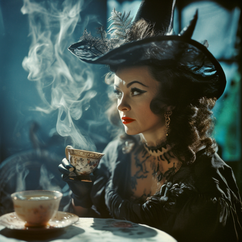 1950s color photograph, beautiful witch with a hot tea, steam looks like a skull --v 6.0