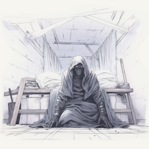 outline of body under white bedsheet, dark and cold stockroom, dungeons and dragons concept art
