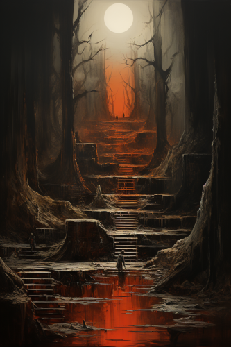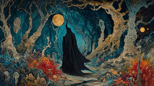 a human figure cloaked in black in the centre of a haunted nocturnal forest during the lunar eclipse, a scene of eldritch horror, occult terror, dramatic, ornate, vibrant colors, watercolor + colorpencil + charcoal + ink drawing by Tran Nguyen + Ivan Bilibin + John Bauer + Kay Nielsen + John Howe --ar 16:9 --v 6.0