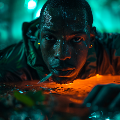 Cinematic Close up of a black man with a knife floating in a swamp, glowing neon accents, nike logo, haze background, sodium vapor color tones, 50mm prime lens, orange and teal --style raw --v 6.0